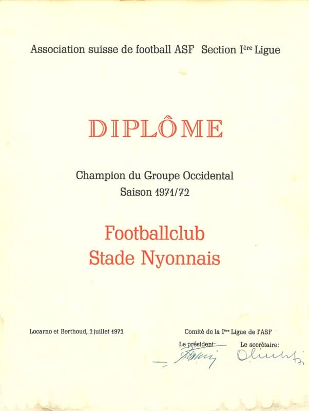 Diplôme de champion de groupe occidental remis par l’Association suisse de football (saison 1971-1972) – Dépôt – Archives communales de Nyon